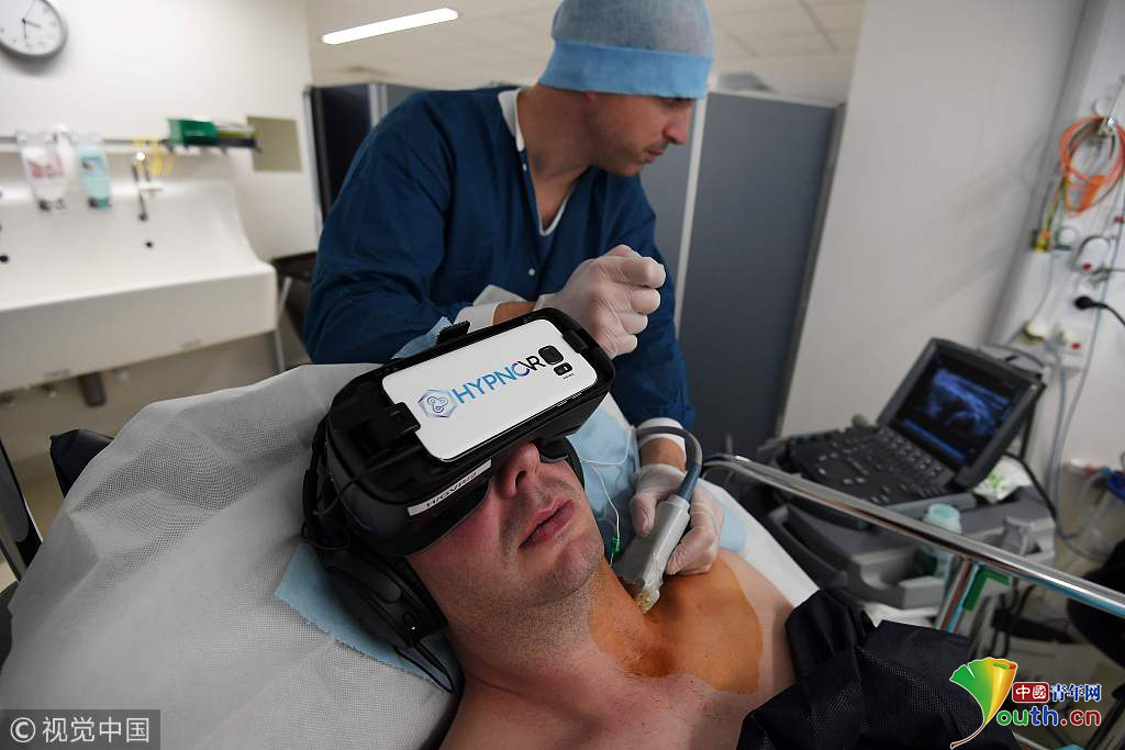 当地时间2018年10月25日,法国斯特拉斯堡,一名催眠麻醉师为头戴虚拟现实设备的病人进行局部麻醉。图片作者:FREDERICK FLORIN
