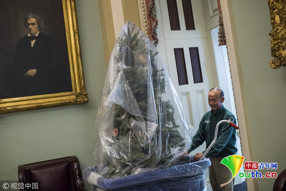 美国华盛顿,圣诞树被搬离国会办公室。