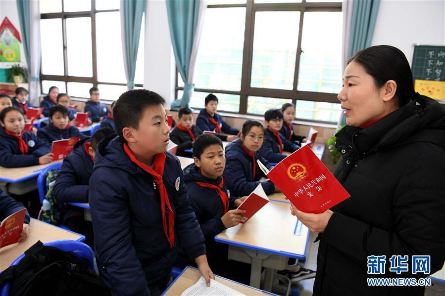 12月4日,合肥市翡翠学校的老师在课堂上讲解宪法知识。 当日是国家宪法日,安徽省合肥市翡翠学校举办主题宣讲活动,对学生开展法治教育,帮助孩子们了解宪法知识。 新华社记者刘军喜摄