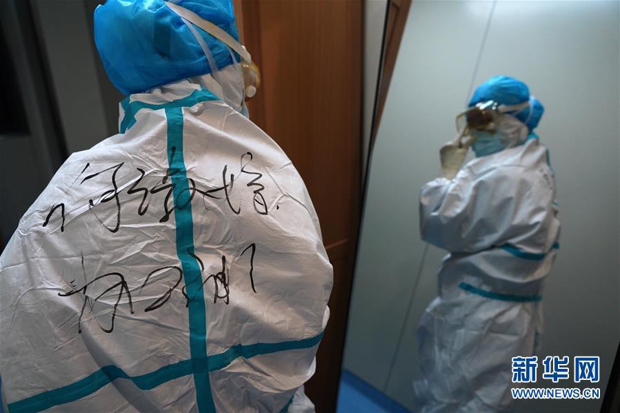 在南昌大学第一附属医院象湖院区,值班护士何淑娟在镜子前穿防护服(2月6日摄)。新华社记者 万象 摄