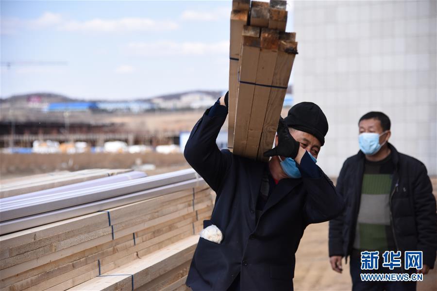 4月10日,工人们在搬运建材。黑龙江省绥芬河市4月6日开始建设方舱医院。建设方介绍,由办公楼改建的方舱医院,可提供600余张床位,预计11日启用。 新华社记者 董宝森 摄 图片来源:新华网
