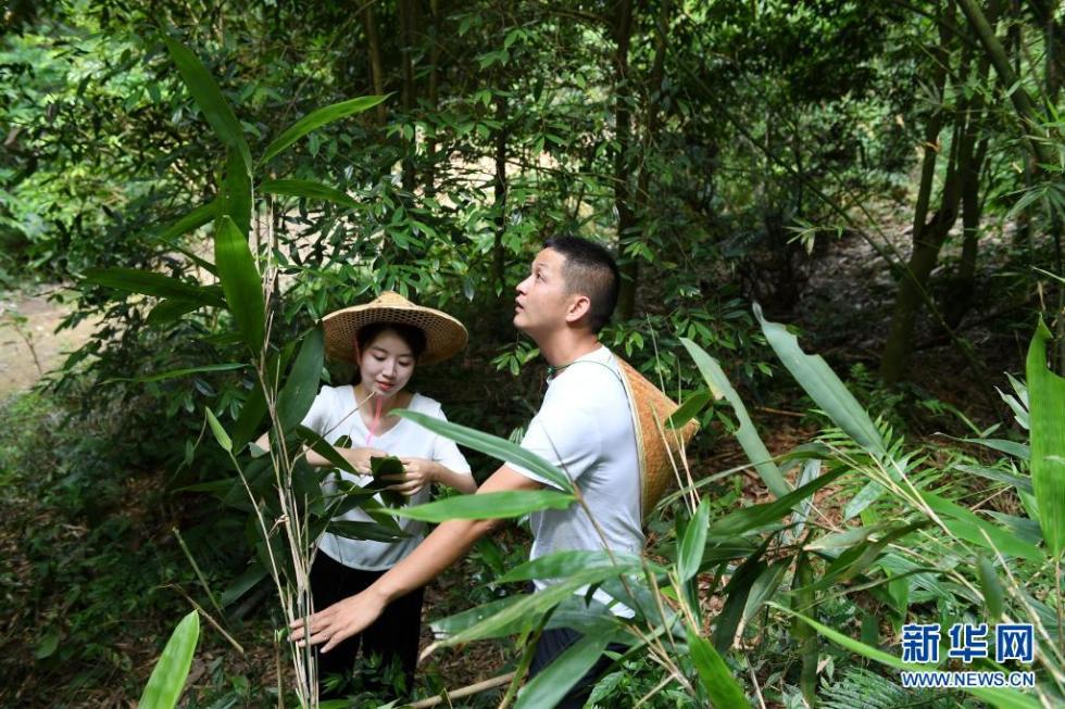 5月19日,柯嘉华(右)和周晰在南塘村塔尾自然村的山上寻找新鲜粽叶准备用来包装农产品。