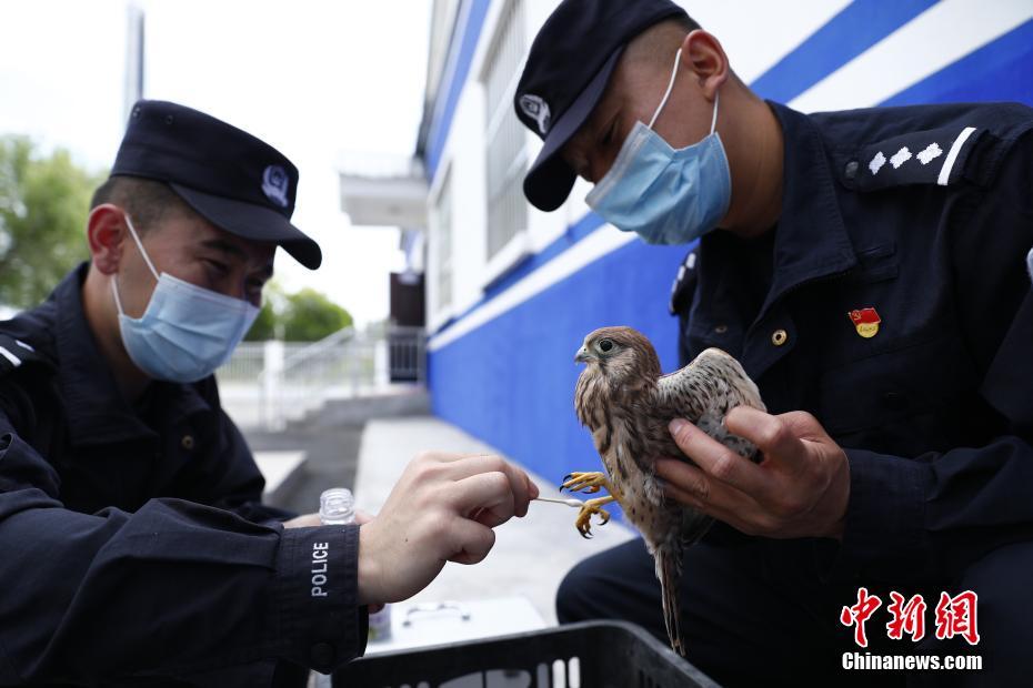 巴克图口岸边境派出所民警正在为鹰隼进行消毒救助。李耿杰 摄