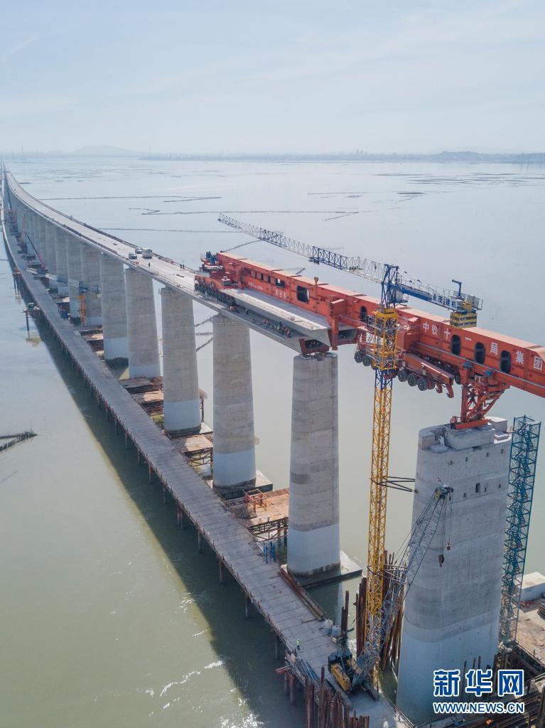 7月11日,在新建福厦铁路湄洲湾跨海大桥建设现场,“昆仑号”在架设该线路最后一孔40米箱梁(无人机照片)。