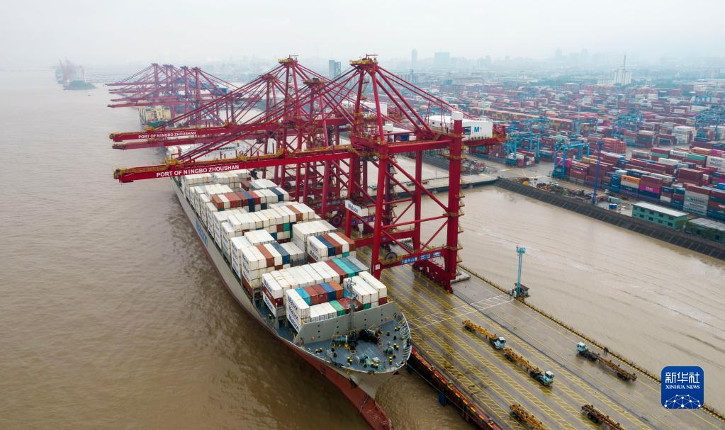 10月18日,在宁波舟山港北仑三期集装箱码头,一艘货轮在装卸货物(无人机照片)。