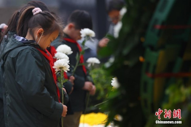 12月12日,在第八个国家公祭日来临之际,南京小学生纷纷来到侵华日军南京大屠杀遇难同胞丛葬地,敬献鲜花,悼念遇难同胞。12月13日是南京大屠杀死难者国家公祭日。图为小学生在侵华日军南京大屠杀遇难同胞正觉寺丛葬地悼念遇难同胞。 中新社记者 泱波 摄