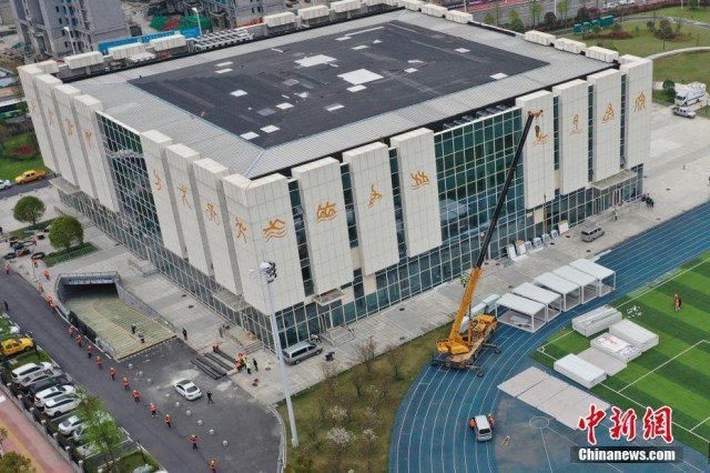 3月20日,航拍位于江西省南昌市新建区欣悦湖体育馆的方舱医院建设现场。当日,记者从南昌市新冠肺炎疫情防控新闻发布会上获悉,目前该市已启动方舱医院建设工作。(无人机照片) 中新社记者 刘占昆 摄
