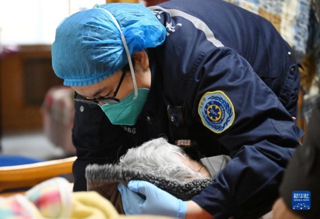 急救队员在接到任务后需在90秒内出车,并立即打电话给病人家属,询问病人具体情况。“在电话里我会指导家属对病人进行简单的处理,电话那头儿焦虑的情绪也催促着我们能快一点、再快一点到达。”谢艳杰说。出紧急任务时,医生谢艳杰和护士陈岩在到达现场后会提起急救箱向患者家一路跑去。