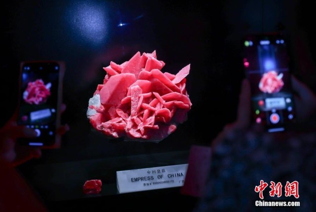 5月4日,2023中国南京(国际)矿物宝石化石博览会在南京国际展览中心开幕,来自世界各地的矿物宝石化石精品集中亮相。该博览会以“红色矿物”为主题,设有国际矿晶区、矿物晶体区、化石陨石区、珠宝区、观赏石展区五大展销区。据了解,作为观赏石大家庭中重要的一部分,矿物晶体(宝石)以其绚丽多彩的色泽、变化多端的造型、独特稀缺的资源性受到越来越多的藏家和爱好者的喜欢。图为绝美菱锰矿亮相2023中国南京(国际)矿物宝石化石博览会。