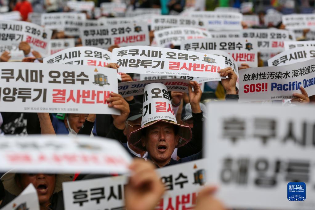 6月12日,民众在韩国首尔手举标语牌参加集会,反对日本核污染水排海。