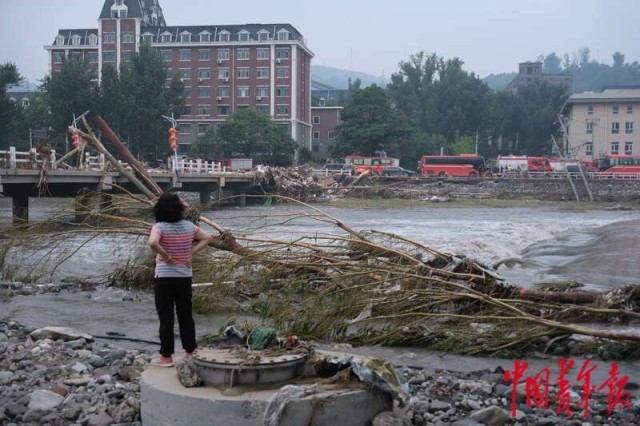 8月3日,北京市门头沟区王平镇,一名当地居民站在河道旁。该镇沿永定河北京河段上游河道两侧建设,由于连日暴雨形成洪水。据央视报道,7月31日,位于王平镇下游的三家店拦河闸下泄流量为3700立方米每秒,已经超过了50年一遇的洪水的级别。中青报·中青网见习记者 田嘉硕/摄