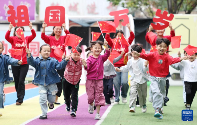 9月26日,山东省临沂市郯城县郯城街道官塘幼儿园的老师和孩子进行课间“快乐跑”。