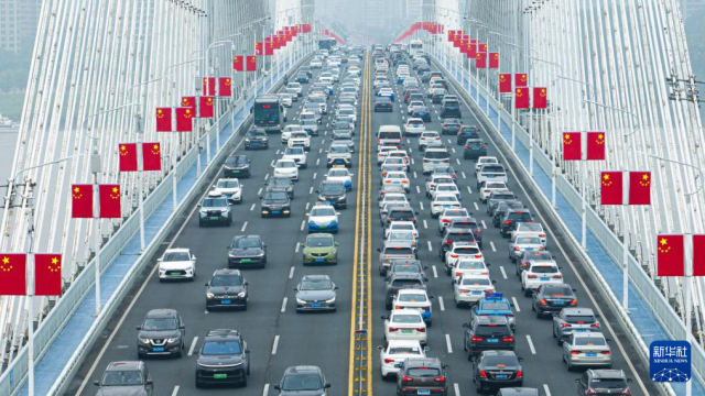 10月1日,车辆行驶在湖北省武汉长江二桥上(无人机照片)。