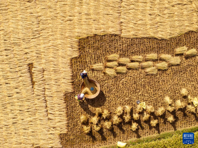 10月3日,农民在云南省大理白族自治州洱源县右所镇收割水稻(无人机照片)。
