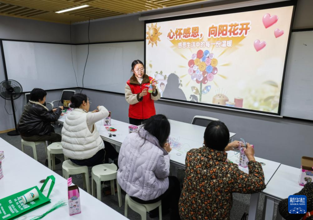11月27日,在孝顺镇府东社区的党群服务中心,志愿者教居民制作手工艺摆件。
