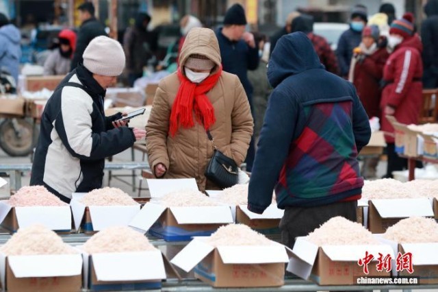 1月29日,山东省滨州市沾化区,春节将近,冯家镇“黄河大集”吸引众多市民前来采购年货。沾化区濒临渤海湾,冯家镇大集是以海产品交易为核心的特色集市,冯家镇作为滨州渔业重镇,海产品年交易量达13.5万吨。据悉,自2023年“黄河大集”春节季启动以来,沾化区累计举办“黄河大集”90余场次。中新社记者 梁犇 摄