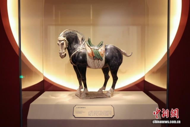 1月29日,“跃马扬鞭——马年新春文化展”在北京中国国家博物馆开幕。展览遴选与马相关的精品文物120余件/套,全方位、多角度展示出马在中华文明长卷中的千姿百态,生动阐释马在中华文化中的深厚内涵和时代价值。图为三彩黑釉陶马。