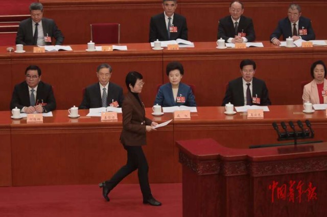 3月7日,北京,人民大会堂,解冬委员上台,准备代表民建中央作题为《推动科技创新和产业创新深度融合 塑造高质量发展新动能》的发言。当日,全国政协十四届四次会议在北京人民大会堂举行第二次全体会议,政协委员进行大会发言。中青报·中青网记者 陈剑/摄