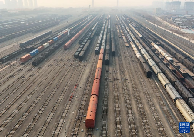这是3月17日在哈尔滨南站拍摄的编组后装载春耕备耕农资的货运列车(无人机照片)。