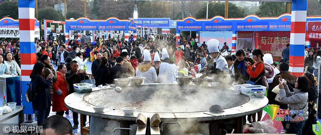 2017年12月20日,冬至临近,贵州省遵义市一商家特别制作了一口直径为3米的大铁锅,在该市凤凰山文化广场烫羊肉粉,吸引市民和游客一起品尝,祈福来年风调雨顺。据悉,当地群众有冬至吃羊肉的习俗。