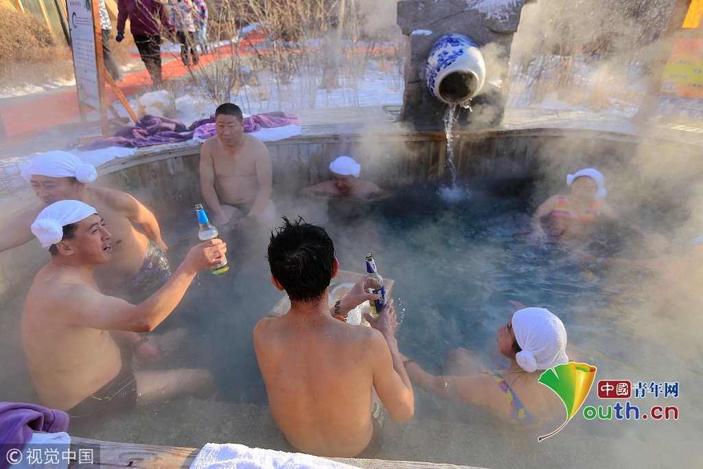 2017年12月24日,黑龙江省大庆市,新年到来之际,大庆连环湖温泉景区日接待游客近3000人,迎来了今冬的首个客流高峰。不少游客在室外-20℃的气温中,泡着温泉喝着啤酒,吃着小酒的小菜儿,舒舒服服迎新年。