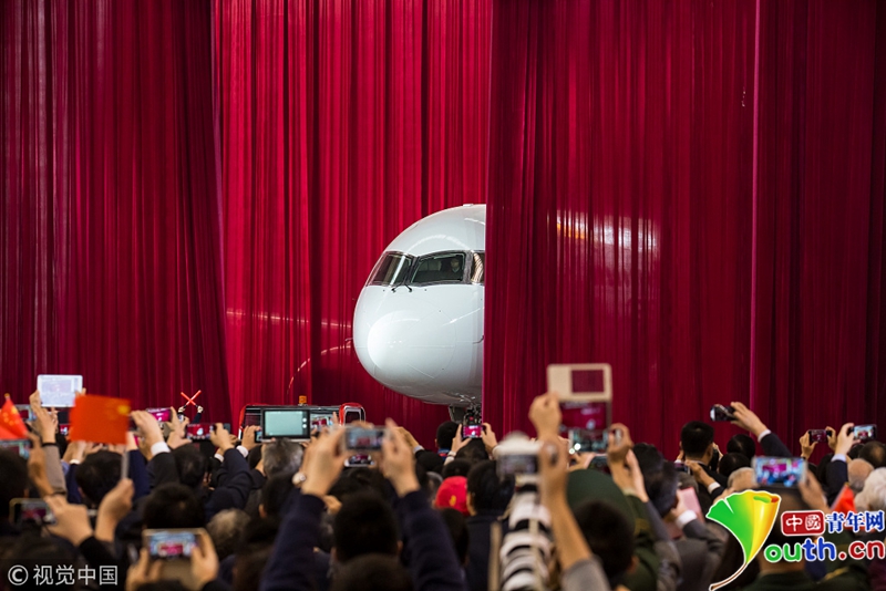 2015年11月2日,上海,我国自主研制的C919大型客机首次全球公开亮相。C919总装下线揭幕式。图片作者:《航空知识》陈肖
