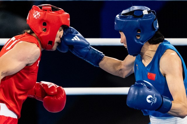 当地时间8月6日,法国巴黎,巴黎奥运会拳击女子66公斤级半决赛,中国队选手杨柳(右)和中国台北队选手陈念琴在比赛中。中青报·中青网记者 李隽辉/摄