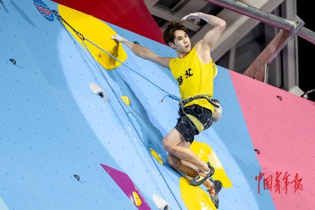 11月13日,广东广州,第十五届全国运动会攀岩项目男子难度决赛,湖北队选手潘愚非完赛后向观众挥手致意。潘愚非获得该项比赛的冠军。中青报·中青网记者 李隽辉/摄