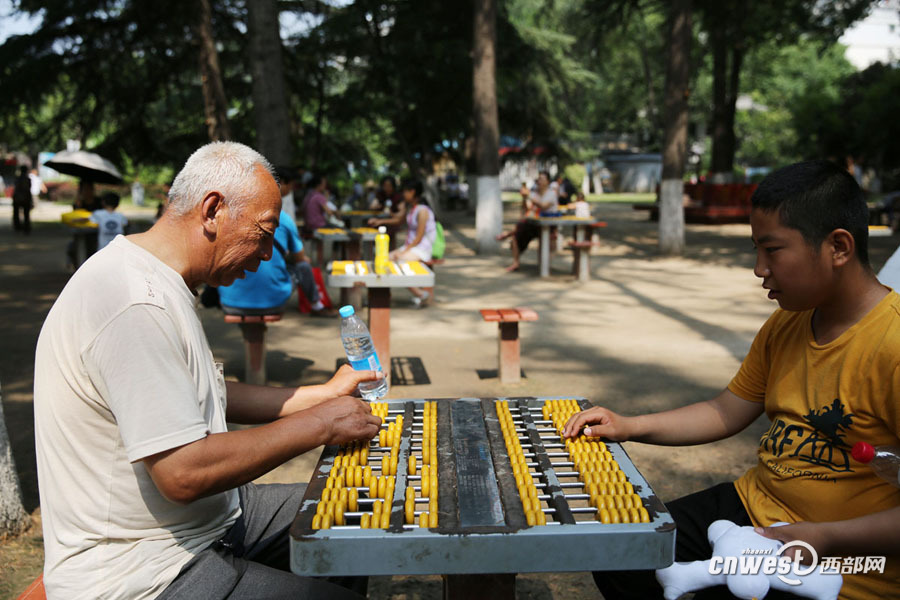西部网讯(记者 魏永贤)7月1日,西安高温,兴庆宫公园树林里的10多架算盘架架都有人玩,人们噼噼啪啪拨动算珠,转动大脑活动十指。