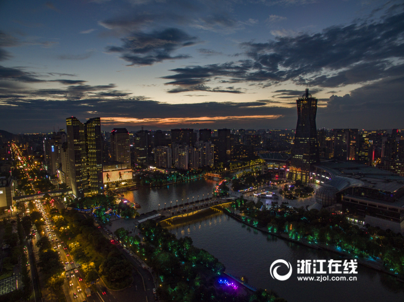 7月3日傍晚,雨过天晴的杭城绽放壮丽晚霞,华灯初上的城市在霞光中格外迷人。(浙江在线记者 杨晓轩 摄)