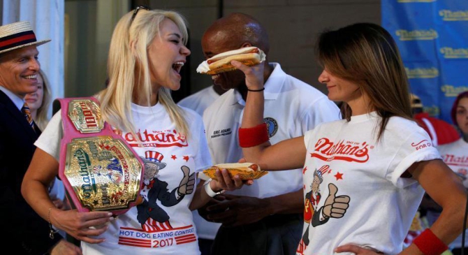 直击纽约热狗“大胃王”比赛 选手身