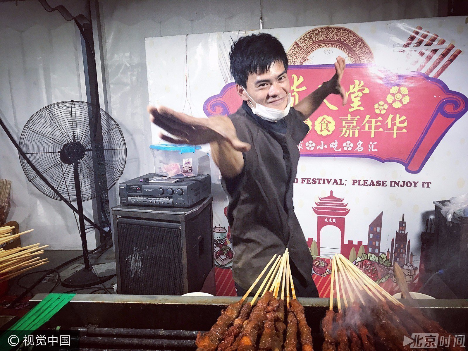 2017年7月14日,浙江省杭州市一美食节上,一家烧烤小摊前围满了顾客。烧烤小哥一边烧烤,一边销魂地手舞足蹈。现场歌声响亮,一下子吸引了许多顾客。高温下,烧烤小哥手舞足蹈了足足三首歌的时间,却无人购买肉串,看上去有点心疼。