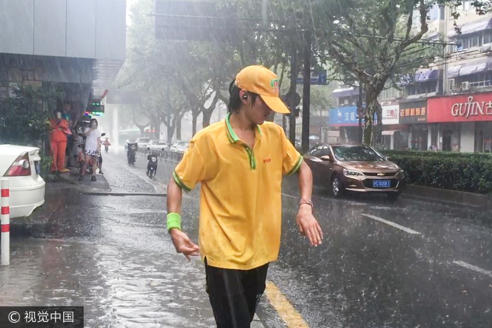 当天,杭州午后下起了暴雨,小郑就在路边即兴跳起了舞。