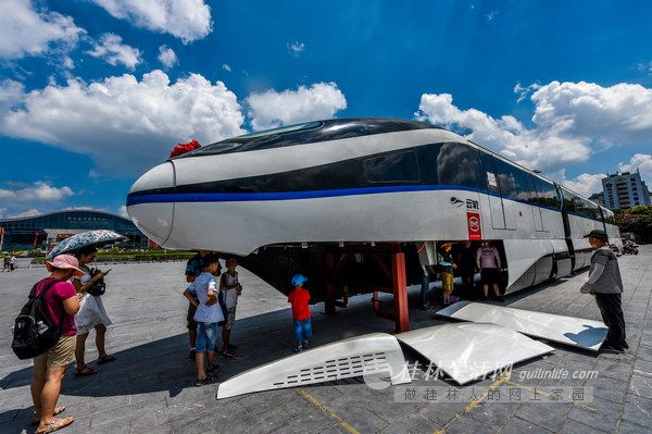 桂林生活网讯 8月19日,一辆标有比亚迪LOGO的云轨列车出现在甲天下广场。高大漂亮的车身吸引了许多过往市民的目光,纷纷拍照发朋友圈,称“即将在桂林建设的云轨列车原来就是这个样子”。