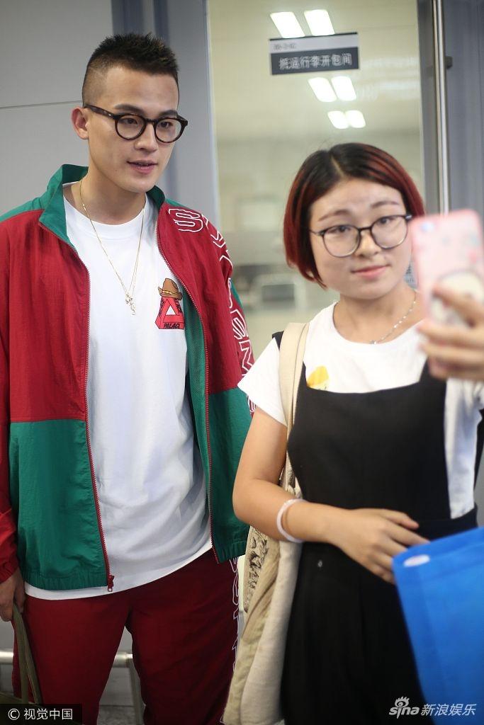 上海,8月19日,欧豪现身机场。欧豪一身抢镜的supreme“红配绿”运动装现身机场,戴着黑框眼镜,潇洒的板寸头,一秒变痞帅boy,他与众多迷妹贴面合影。