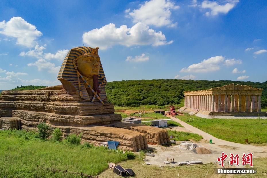 8月23日,安徽滁州田间,一家景区内外按比例制造的“钢铁侠”、“狮身人面像”、“天坛”、“大明宫”、“古希腊神殿”等格外的引人注目。图为“狮身人面像”和“古希腊神殿”。 泱波 摄