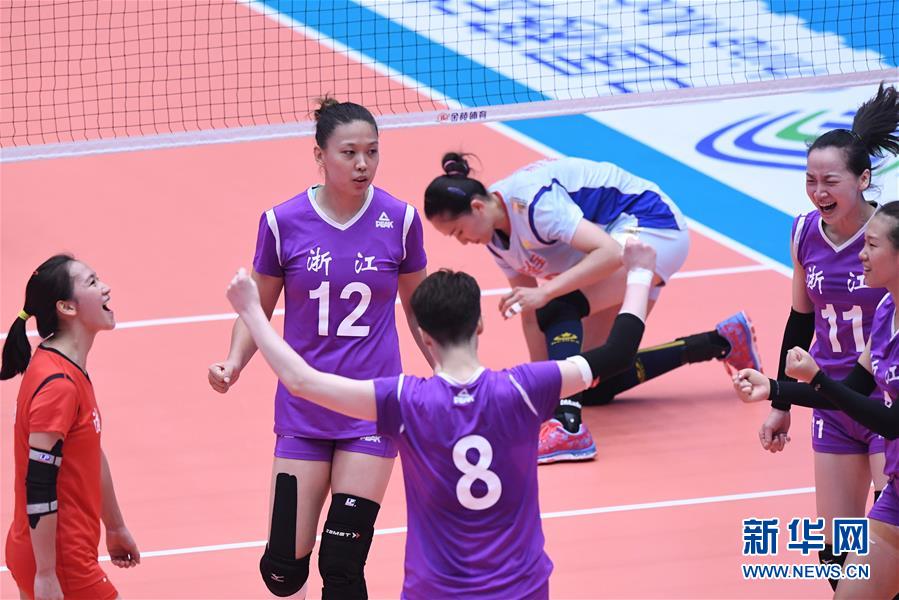 8月23日,浙江队球员在比赛中庆祝得分。新华社记者黄宗治摄 8月23日,在天津进行的第十三届全运会排球女子成年组A组小组赛中,浙江队以3比0战胜天津队。