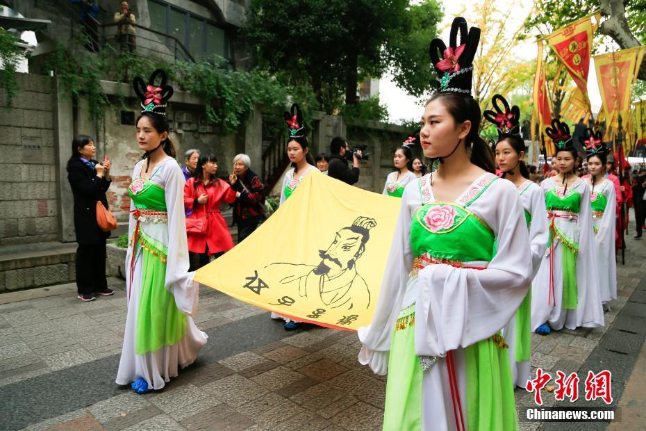 11月10日,一群身着古装的姑娘们手持伍子胥画像正在巡游。当日,2017吴山庙会暨伍子胥祭祀大典在浙江杭州举行,来自全国各地的伍氏后人与社会各界人士身着传统服饰,在伍公庙内献花敬酒、宣读祭文、集体参拜,并在祭祀大典结束后手挽伍子胥像,随盘鼓队、幡旗队、舞龙队巡游祈福。中新社记者 王远 摄