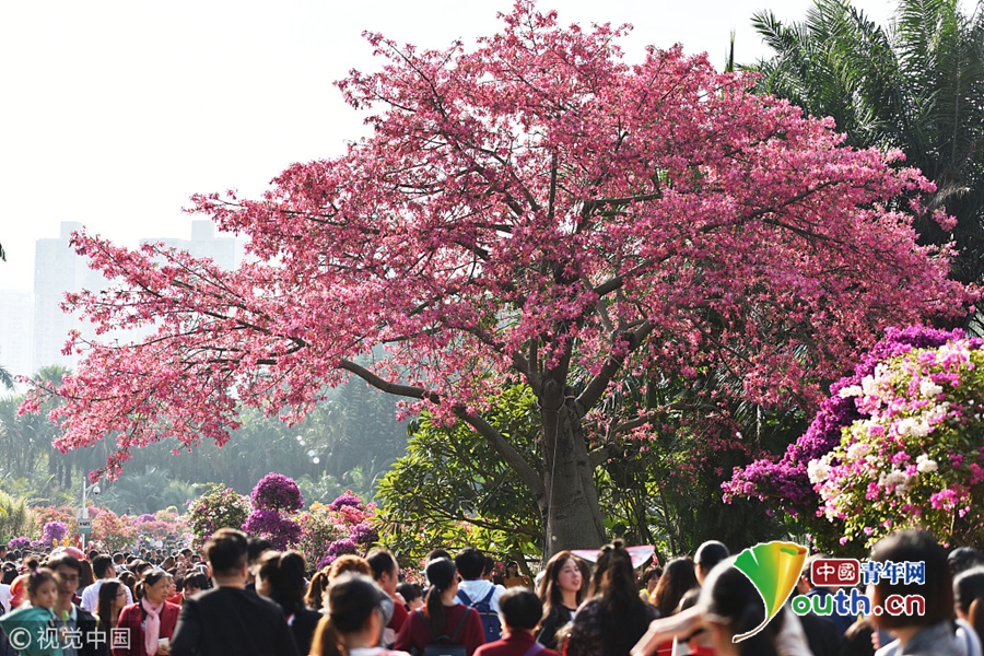 2017年11月26日,深圳第19届簕杜鹃市花展迎来了游客观赏高峰,莲花山公园内的草坪上人流攒动,摩肩接踵,场面堪比黄金周。位于莲花山公园大门附近,被誉为“最美一棵树”的美丽异木棉树花开正盛,优美的造型、淡粉色的花朵在阳光下特别出彩,遭到了游客的疯狂围观。