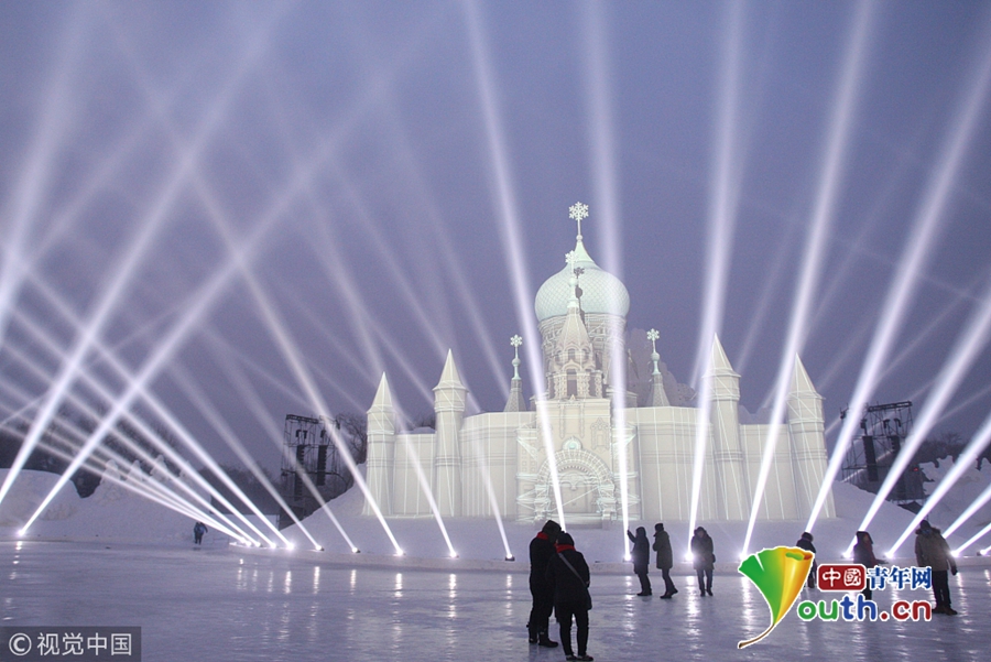 2018年1月1日晚,哈尔滨市太阳岛雪博会上的300米主塑前上演了3D幻影雪景灯光秀。五彩的灯光照射下,雪雕群构成了一个童话里的世界,吸引了许多游客前来观看。