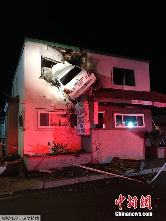 美国加州发生“离奇”交通事故 汽车“飞入”二楼窗户