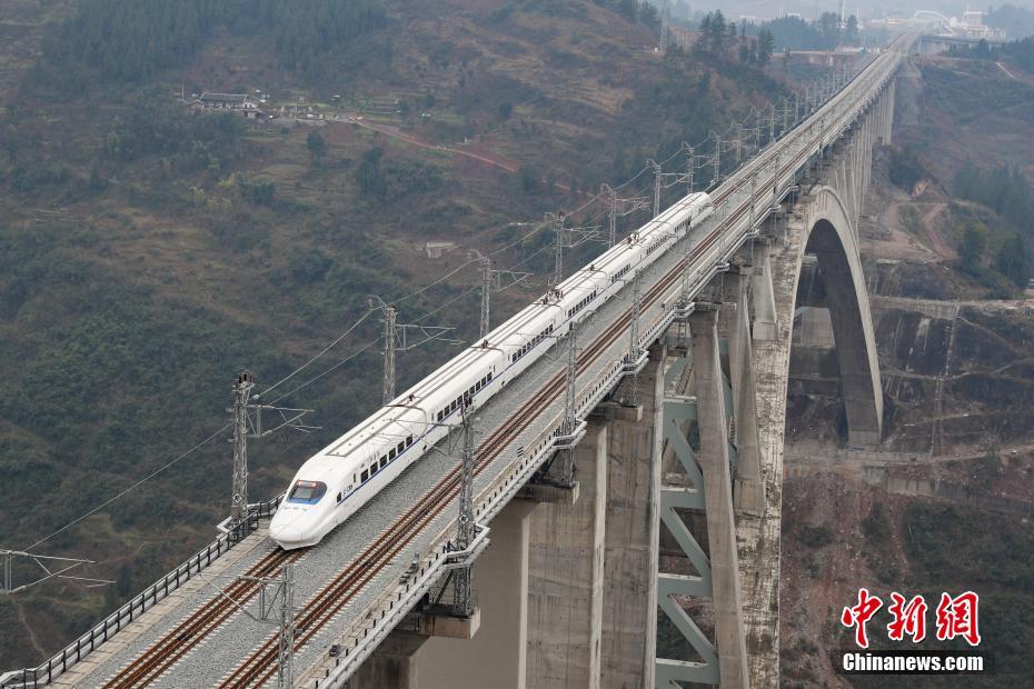 1月16日,一列动车从渝贵铁路夜郎河特大桥桥面驶过。世界首例“贯入式大体积嵌岩拱座基础”大桥已建成投用。夜郎河特大桥全长1120.8米,为一跨370m钢筋混凝土提篮式拱桥,桥梁轨底标高714.792米,沟底标高505.1米,是渝贵铁路三大控制性工程之一。中新社记者 贺俊怡 摄