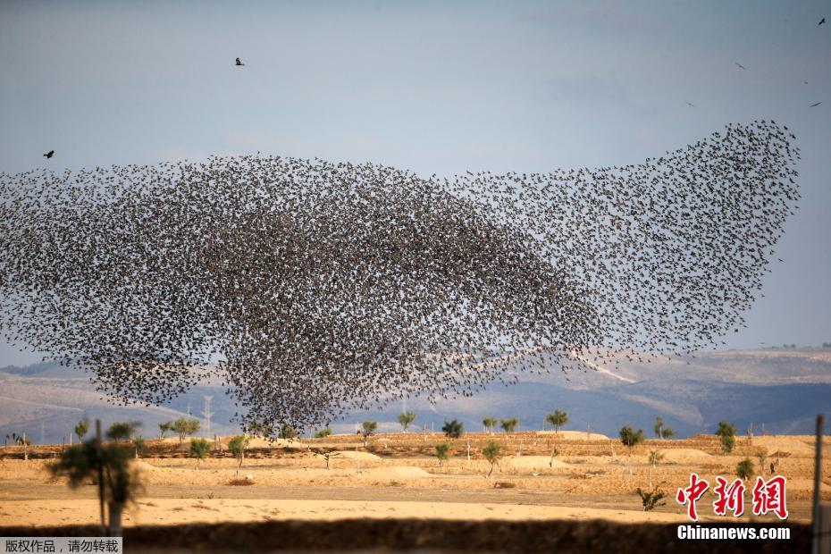 当地时间1月16日,以色列Beit Kama村,一群椋鸟在天空飞翔,场面壮观。