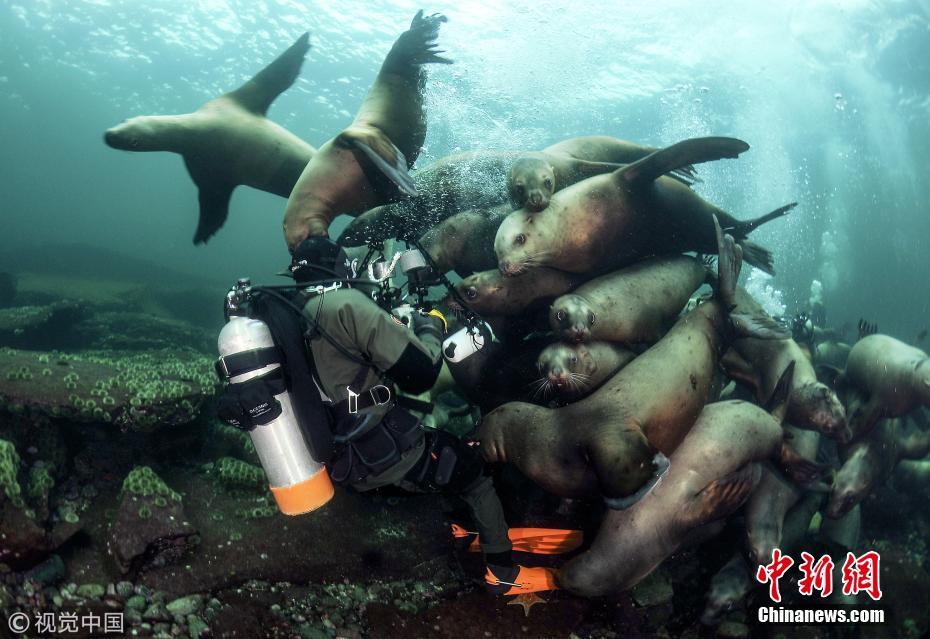 1月18日讯(具体拍摄时间不详),加拿大温哥华岛,35岁的英国摄影师Steve Woods在潜水拍摄时被大群海狮围观。海狮在当地海域等待鲱鱼鱼群的到来,届时将与逆戟鲸与座头鲸争抢食物。虽然海狮看上去很凶猛,其实是很细心的动物,与人类接触只是想看看面前的生物究竟是什么,就像好奇的小狗一样想跟人玩耍。图片来源:视觉中国