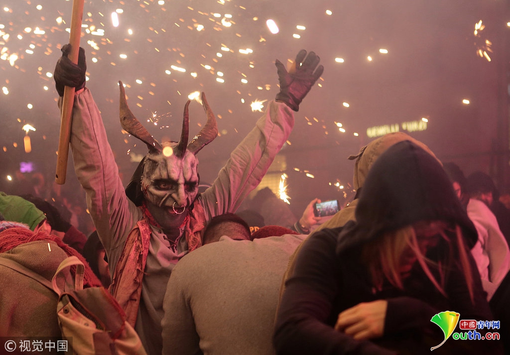 当地时间2018年1月21日,西班牙马略卡岛的帕尔马,狂欢者参加“魔鬼跑火节”。 “魔鬼跑火节”是西班牙加泰罗尼亚地区的传统节日。这一天,人们打扮成魔鬼,手持火把或烟花,尽情狂欢。图片作者:ENRIQUE CALVO/视觉中国