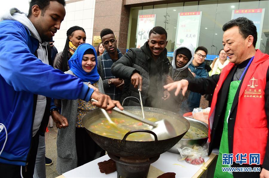1月22日,社区居民指导留学生熬制腊八粥。腊八节将至,来自巴基斯坦、牙买加、埃塞俄比亚等国的江苏大学留学生走进镇江市和平路街道金山水城社区,与社区居民一起制作、品尝腊八粥,感受中国传统文化。新华社发(石玉成 摄)