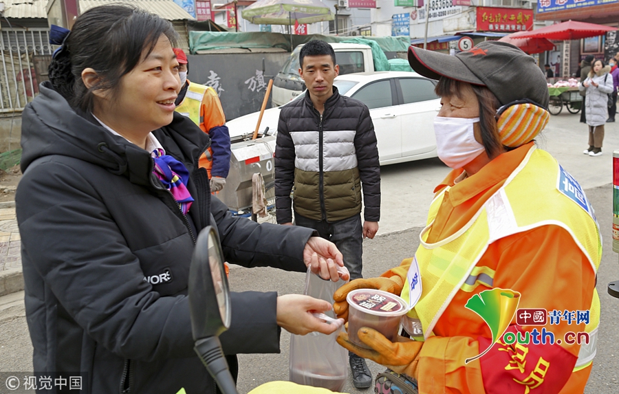 2018年1月23日,西安。“师傅,你们辛苦了,我们熬的腊八粥送给您!”1月23日上午10时许,在丈八西路正忙着清理垃圾的保洁员王文军和他的工友们,没想到有人给他们送上热腾腾、香喷喷的腊八粥。这些腊八粥是锦业路绿地世纪城附近一家工商银行的员工亲手熬制的,一上午,300多碗腊八粥全部送给了附近的保洁员、执勤交警和消防战士。黄利健/华商报/视觉中国