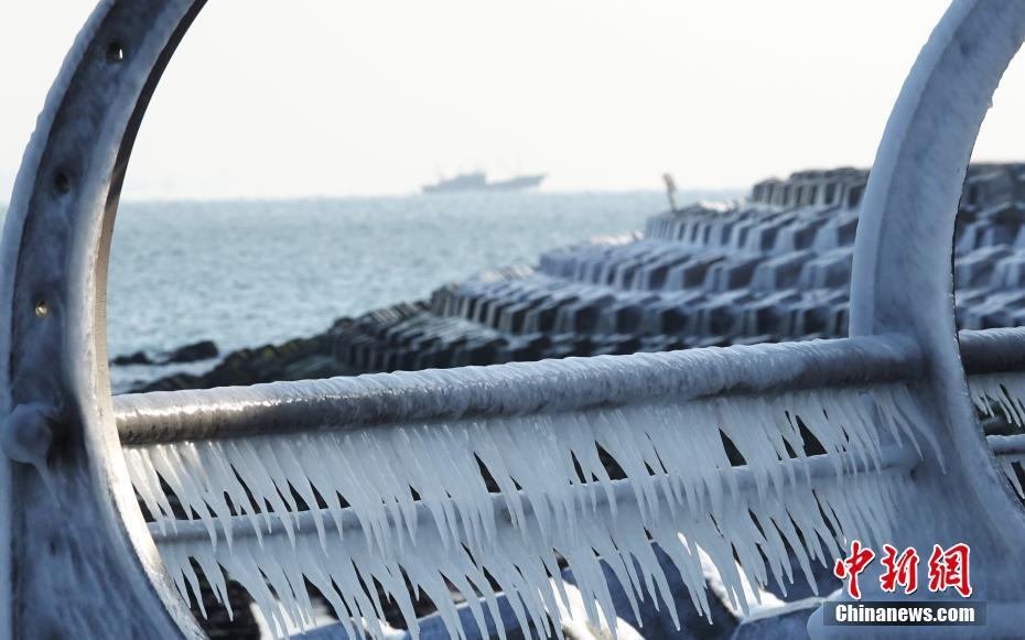 1月23日,大连市东港商务区沿海栈道护栏上的冰挂。受强冷空气影响,从1月21日夜间开始,辽宁大连市出现降雪和大风降温天气,滨城开启了冰冷模式。中新社发 刘德斌 摄 图片来源:CNSPHOTO