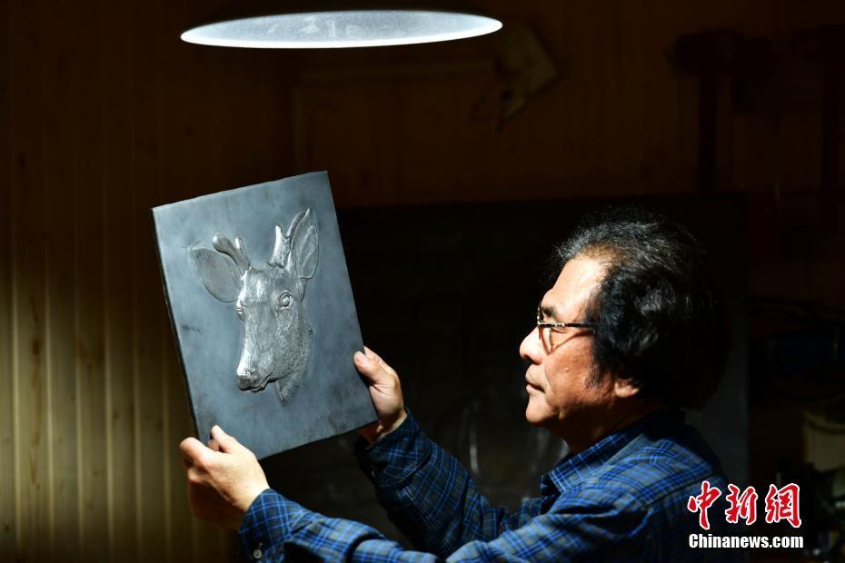 3月16日下午,在河北石家庄“郭氏铁板浮雕”创始人之一郭海博的工作室,他正在用铁锤在铁板上“作画”。据了解,郭海博苦练30年,练就了“铁板浮雕”绝技。铁板浮雕是在生冷坚硬的铁板上,经过拓印、正面锻阴纹、打磨、火烧等十几道工序,用榔头、錾子敲打出一幅幅生动逼真、质感强烈的艺术作品。图为郭海博仔细检查铁板画。中新社记者 翟羽佳 摄