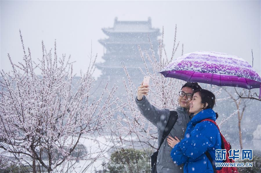 3月17日,游客在雪花飞舞的平遥古城迎薰门外合影留念。当日,山西省晋中市平遥县迎来降雪天气,雪中的平遥古城银装素裹。 新华社发(梁生仁 摄)